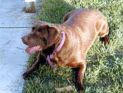 Our puppy, "Sophie," is doing great. Her and our black Lab, Tank, are now best friends (she never leaves his side), and she is like a daughter to Elisabeth and I. She is a very pretty, smart, and loving dog. She's very tall and lean, and has a beautiful dark coat. We think that she looks a lot like her parents, and that she is one of the best looking chocolate Labs we've seen. She loves to play and to use her nose to sniff and check things out. It's funny how she won't stop playing fetch. The only way to get her to quit sometimes is to take the ball away from her. She also loves the water. She's always trying to sneak in the shower with everyone, and we've caught her many times playing in the empty bathtub by herself. She's a real character, and we're very lucky to have her. She's now around seven months old and weighs about 55 pounds. We have a ton of pictures of her. I'll try and send some soon. Talk to you later,